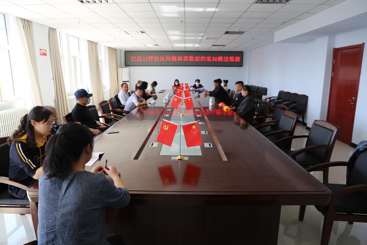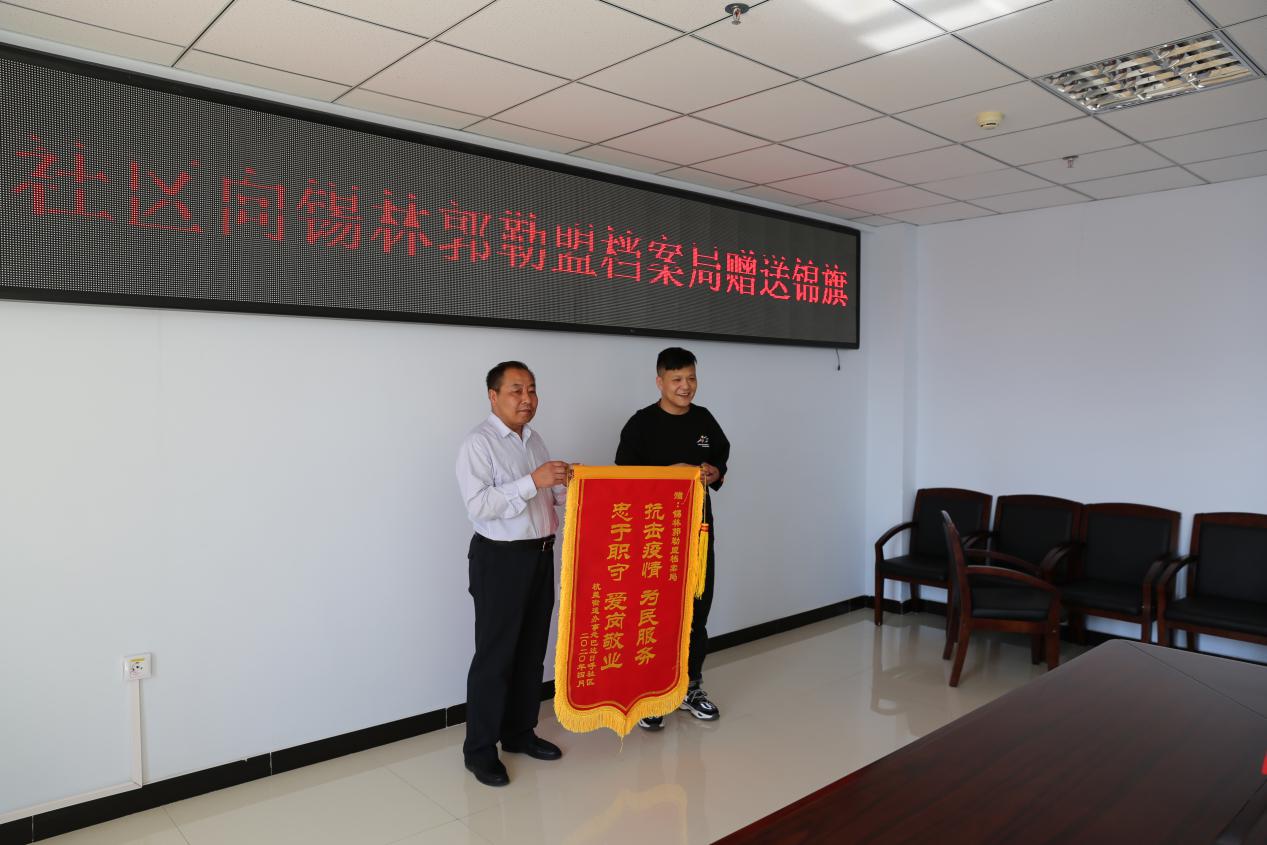 4月10日上午,杭盖办事处巴达日呼社区夏立民书记将写有“抗击疫情 为民服务 忠于职守 爱岗敬业”的锦旗送到包联单位盟档案局,向在疫情期间冲锋在前、坚守一线的全体档案工作人员表达诚挚的谢意。