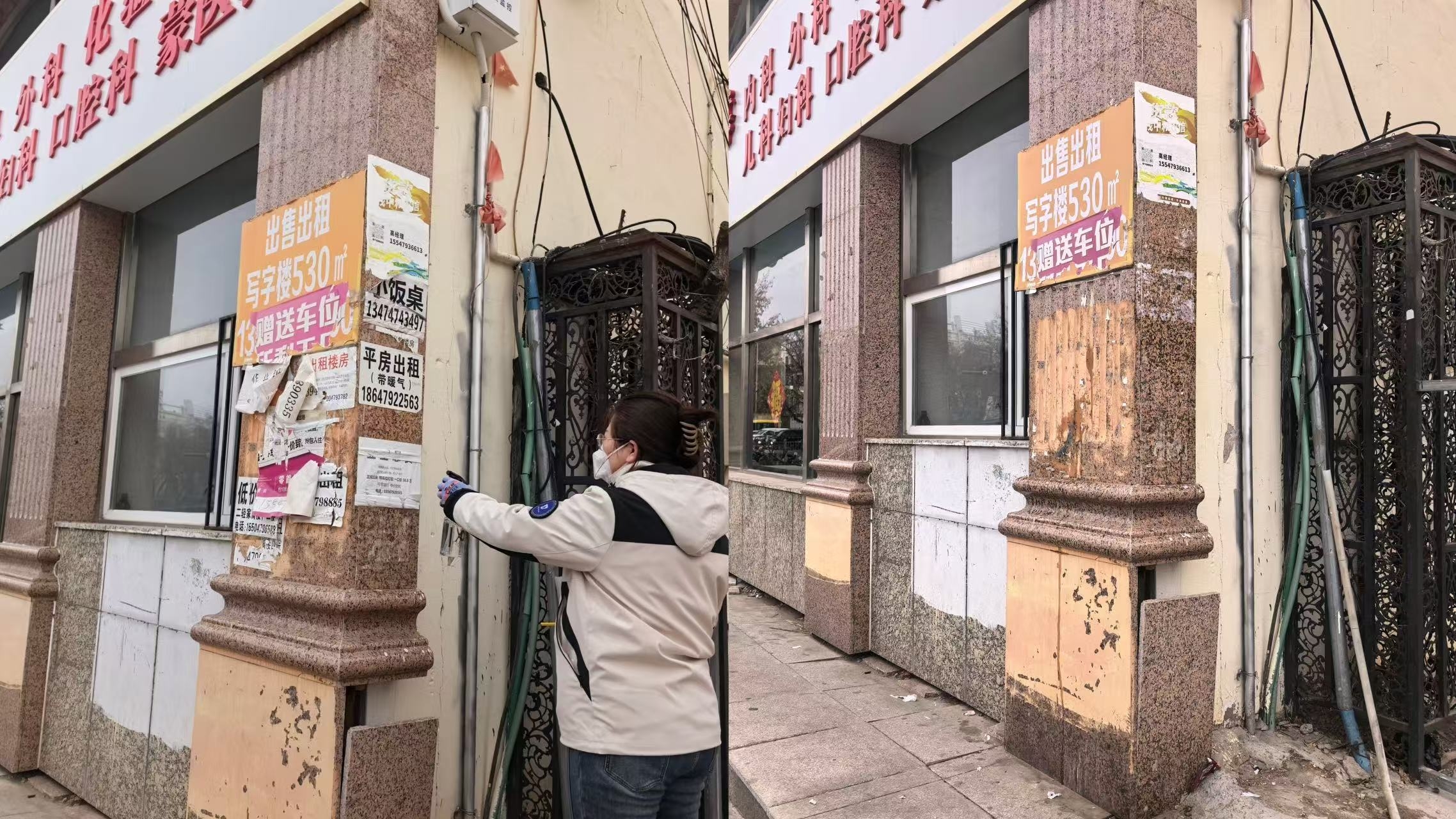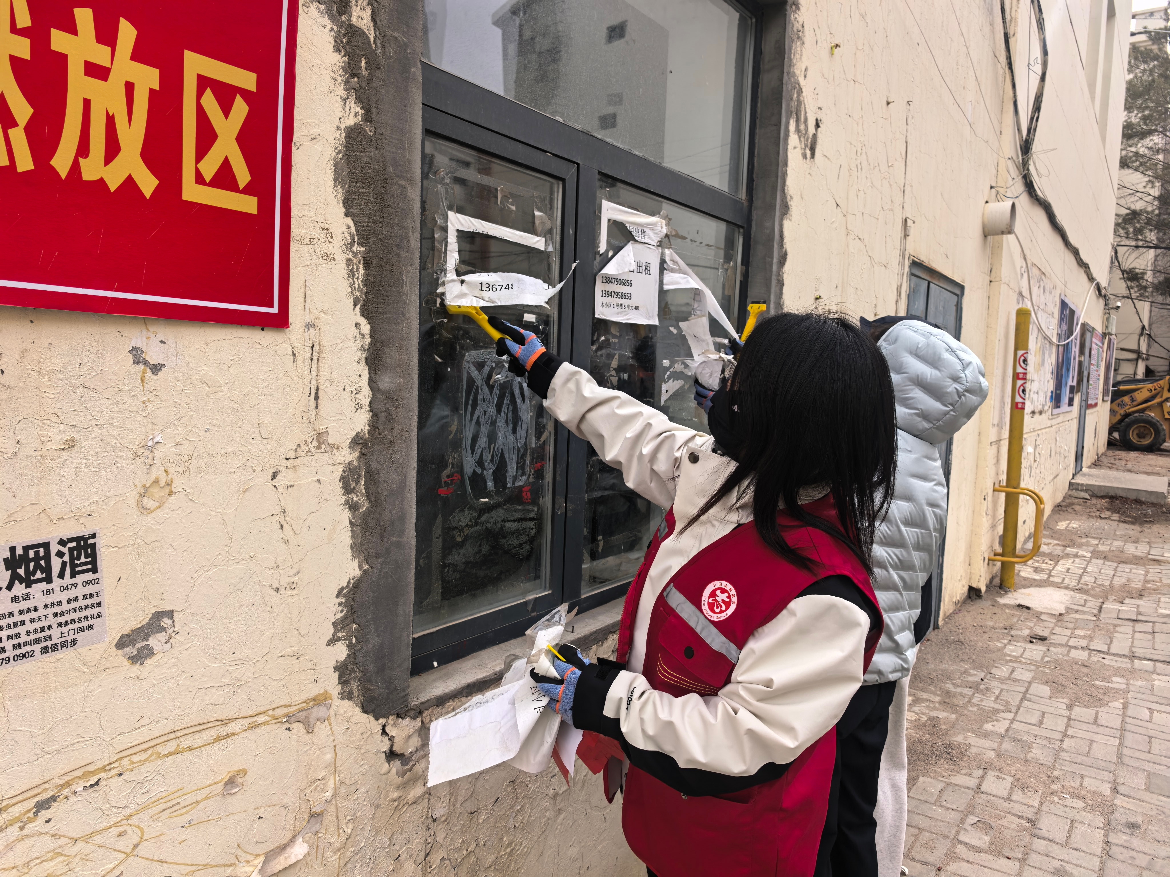 此次行动覆盖鹰冠庄园、环宇小区、档案局家属楼、农业局家属楼4个包联小区。工作组对10栋楼、31个单元进行逐层排查,重点对小区楼栋外墙、楼道墙面、单元门、电表箱、楼梯扶手等公共区域随意张贴和喷涂的小广告进行集中清理。