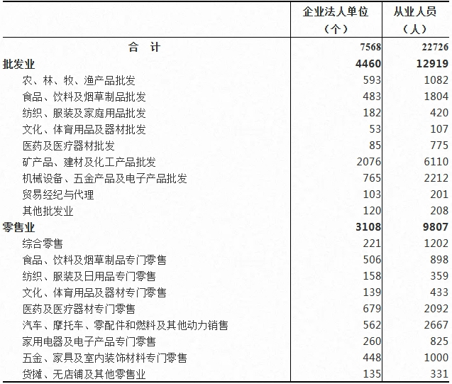 在批发和零售业企业法人单位中,批发业占58.93%,零售业占41.07%。在批发和零售业企业法人单位从业人员中,批发业占56.85%,零售业占43.15%(详见表4-1)。