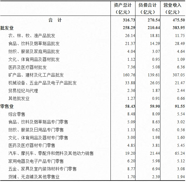 2023年末,批发和零售业企业法人单位资产总计316.73亿元,比2018年末增长18.01%;负债合计270.54亿元,比2018年末增长25.49%。