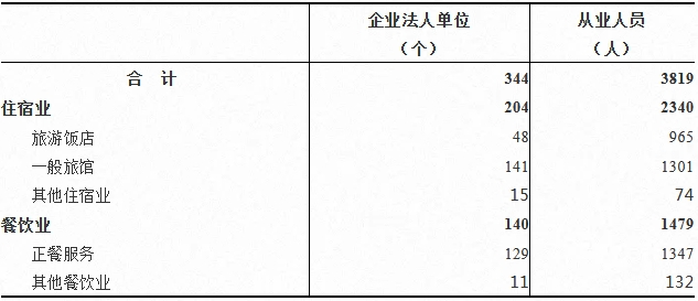 2023年末,全盟共有住宿和餐饮业企业法人单位344个,从业人员3819人,分别比2018年末增长8.52%和-6.83%。