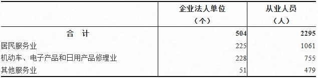 2023年末,全盟共有居民服务、修理和其他服务业企业法人单位504个,从业人员2295人,分别比2018年末增长32.6%和35.2%(详见表5-3)。