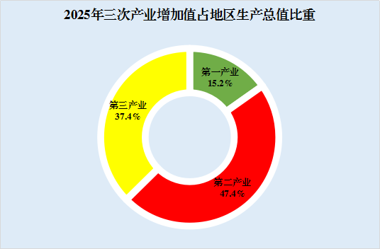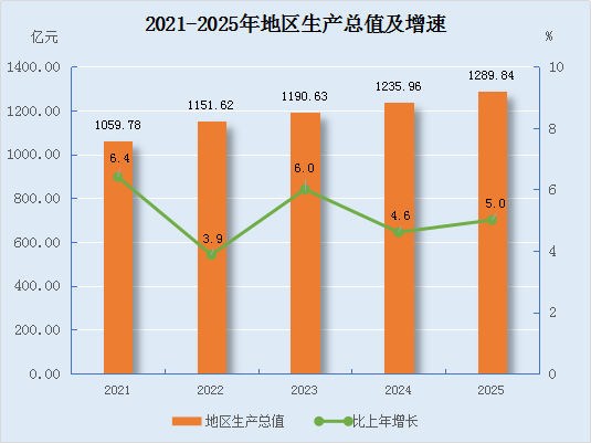 初步核算,全年全盟地区生产总值为1289.84亿元,比上年增长5.0%。其中,第一产业增加值为195.89亿元,增长5.5%;第二产业增加值为611.53亿元,增长6.4%;第三产业增加值为482.42亿元,增长3.5%。三次产业比例为15.2:47.4:37.4。第一、二、三产业对生产总值增长的贡献率分别为17.8%、53.1%和29.0%。人均生产总值达到116728元,比上年增长6.0%。