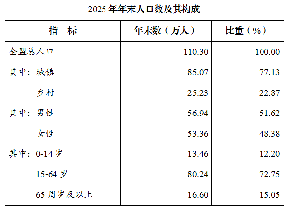 年末全盟常住人口110.30万人,比上年末减少0.95万人。其中,城镇人口85.07万人,乡村人口25.23万人;常住人口城镇化率达到77.13%,比上年末提高0.75个百分点。男性人口56.94万人,女性人口53.36万人。全年出生人口0.41万人,出生率为3.70‰;死亡人口0.85万人,死亡率为7.67‰;人口自然增长率为-3.97‰。