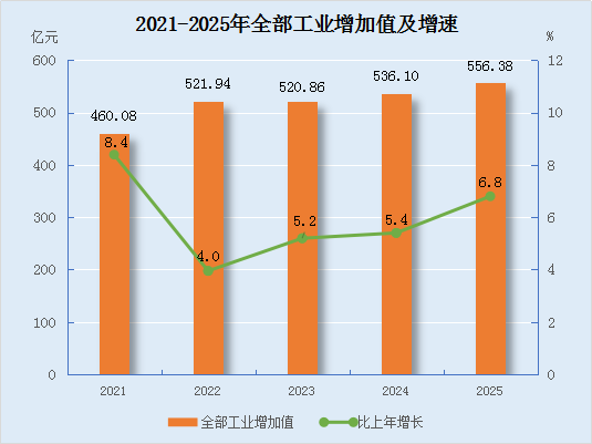 全年全部工业增加值比上年增长6.8%。其中,规模以上工业增加值增长7.6%。在规模以上工业中,分经济类型看,国有控股企业增加值增长3.8%,股份制企业增长6.4%,外商及港澳台商投资企业增长28.3%。分门类看,采矿业增长2.2%,制造业增长24.7%,电力、热力、燃气及水生产和供应业增长13.3%。分重点行业看,装备制造业增长88.7%,化工行业增长23.0%,冶金工业增长7.0%,能源工业增长6.1%,农畜产品加工业增长4.5%。