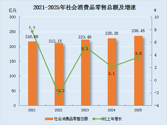 全年社会消费品零售总额236.45亿元,比上年增长3.6%。按经营地统计,城镇消费品零售额217.26亿元,增长3.6%;农村牧区消费品零售额19.19亿元,增长3.9%。按消费类型统计,商品零售额208.88亿元,增长3.8%;餐饮收入27.57亿元,增长2.1%。