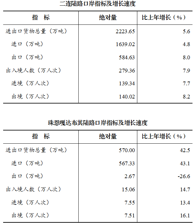 全年进出口总额115.0亿元,比上年增长5.3%。其中,进口总额70.0亿元,增长4.4%;出口总额45.0亿元,增长6.8%。口岸进出口货物量2793.65万吨,比上年增长11.5%。其中,二连口岸2223.65万吨,增长5.6%;珠恩嘎达布其口岸570.00万吨,增长42.5%。出入境人员294.42万人次,比上年增长8.3%。其中,二连口岸279.36万人次,增长7.9%;珠恩嘎达布其口岸15.06万人次,增长14.7%。
