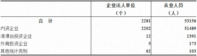 在工业企业法人单位从业人员中,内资企业51489人,占96.9%;港澳台投资企业1391人,占2.6%;外商投资企业173人,占0.3%(详见表3-1)。