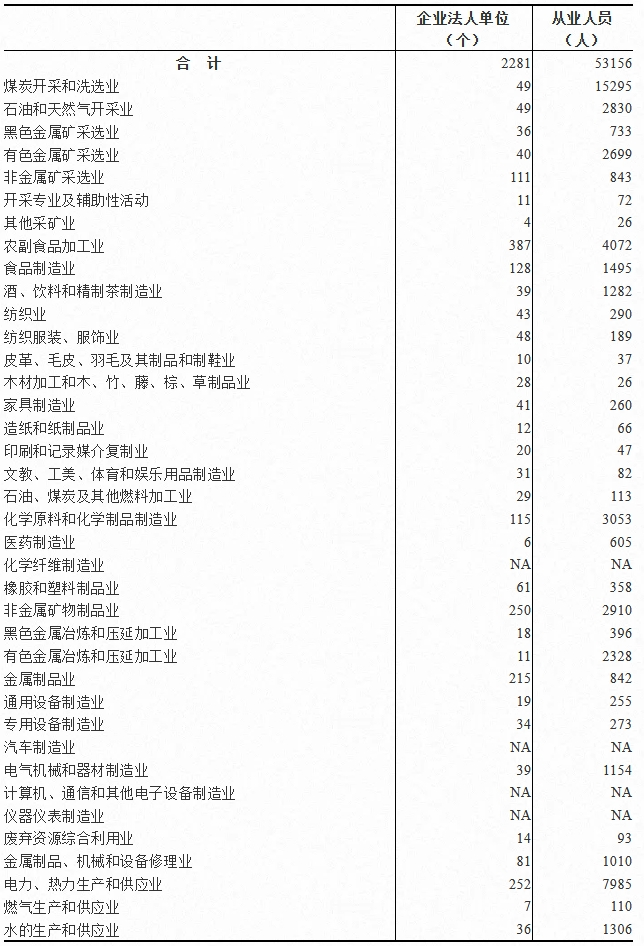 在工业企业法人单位中,采矿业300个,制造业1686个,电力、热力、燃气及水生产和供应业295个,分别占13.2%、73.9%和12.9%。在工业行业大类中,农副食品加工业,电力、热力生产和供应业,非金属矿物制品业企业法人单位数位居前三位,分别占17.0%、11.0%和11.0%。