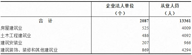 建筑业企业法人单位中,内资企业2087个,占100%。建筑业企业法人单位从业人员中,内资企业13361人,占100%。