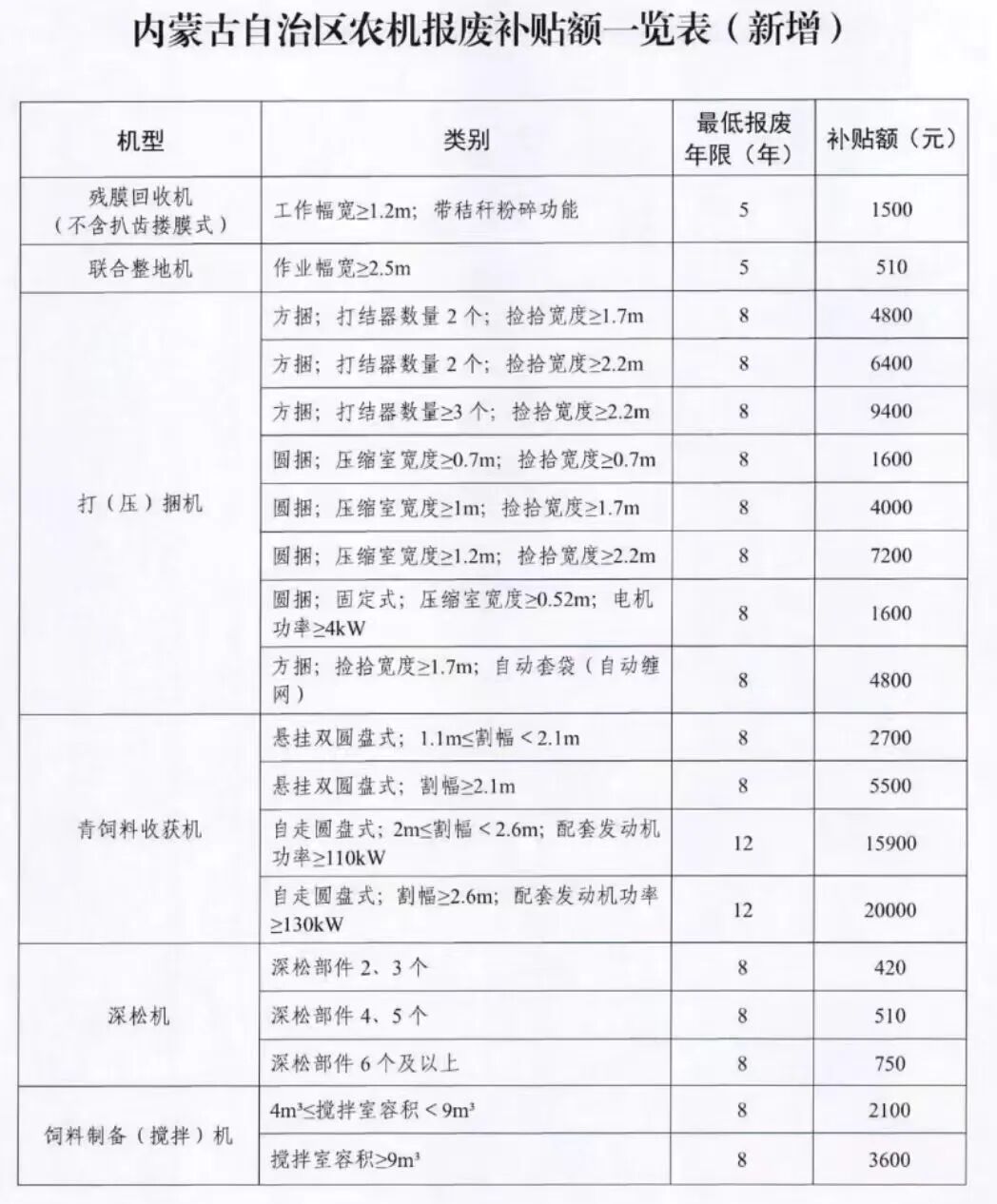 【政策标准】坚持“农牧民自愿、政策支持、方便高效、安全环保”的原则,淘汰耗能高、污染重、安全性能低的老旧农机。中央补贴机具包括拖拉机、播种机、联合收割机、水稻插秧机、农用北斗辅助驾驶系统、机动喷雾(粉)机、机动脱粒机(玉米)、饲料(草)粉碎机、铡草机等9种。