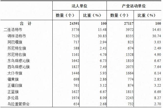 全盟从事第二产业和第三产业的产业活动单位,位居前四位的地区是:锡林浩特市8335个,占30.74%,提高0.91个百分点;二连浩特市3972个,占14.65%,提高3.06个百分点;多伦县2243个,占8.27%,提高0.15个百分点;西乌珠穆沁旗2073个,占7.64%,下降0.89个百分点。