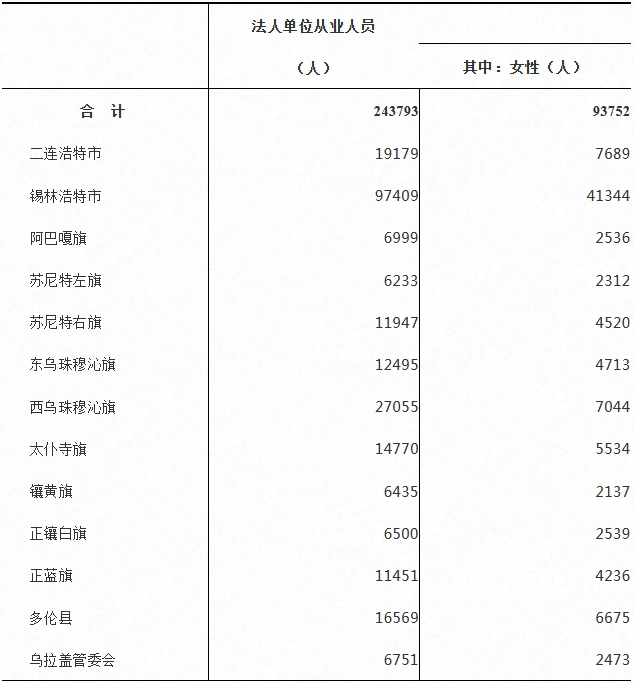 2023年末,在第二产业和第三产业法人单位从业人员中,位居前三位的地区是:锡林浩特市97409人,占39.96%;西乌珠穆沁旗27055人,占11.10%;二连浩特市19179人,占7.87%。按地区分组的法人单位从业人员情况详见表7-2。