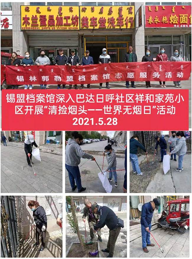 2021年5月31日是第34个世界无烟日,今年世界无烟日的主题是“承诺戒烟,共享无烟环境”。5月28日,我馆组织干部职工深入包联的巴达日呼社区祥和佳苑小区开展“清捡烟头——世界无烟日”志愿服务活动。